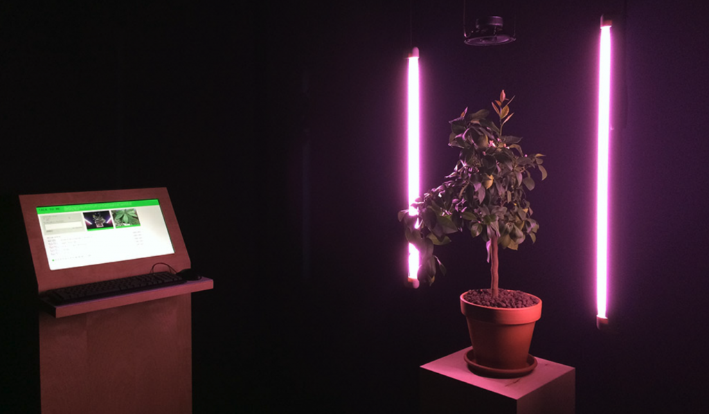 “TALK TO ME”: This interactive installation has create by Rasa Smite, Raitis Smits in collaboration with Martins Ratniks, which introduces the idea of global connectivity between humans and other species. There are scientific hypotheses that communicating with plants makes them grow better. Installations online interface in combination with text to speech engine allows exhibition visitors and all online users to “talk” to the plants remotely, whereby uniting them into one network (Fig 1).