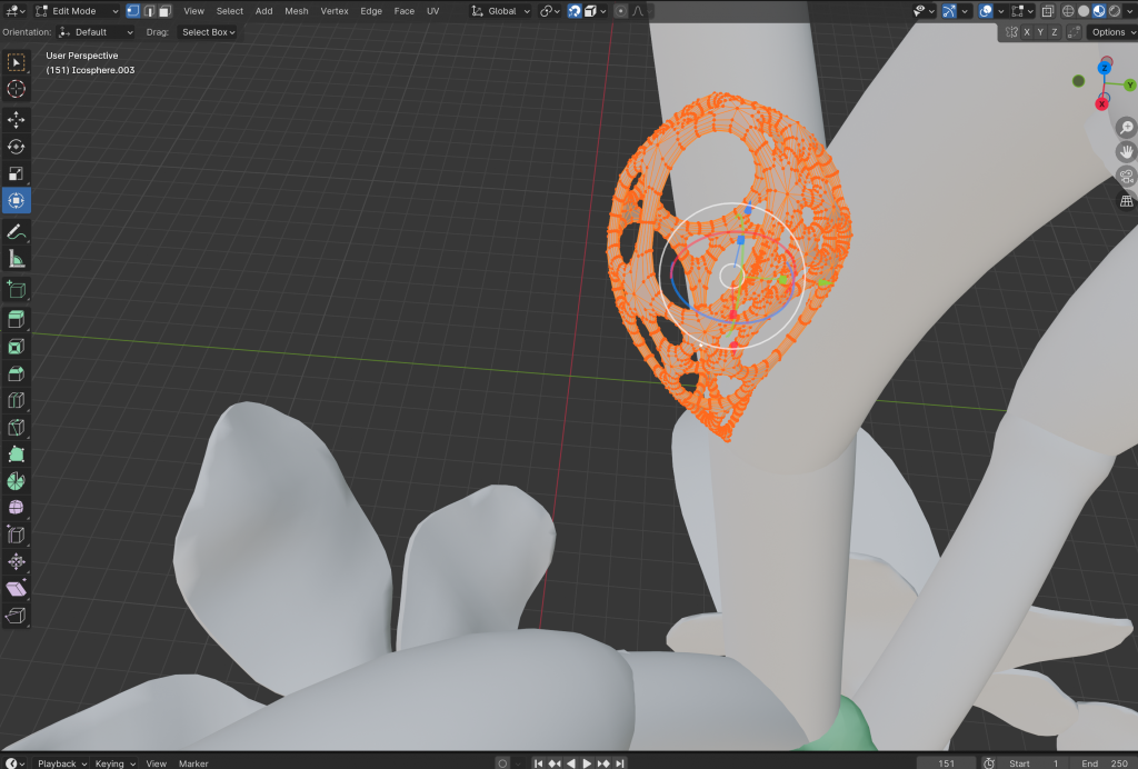 By using BlenderKit, I was able to explore surface reflectivity, translucency, and subtle specular qualities, adding a sense of moisture and life to the digital form. The final appearance integrates previous structural and conceptual decisions into a unified visual statement, a virtual organism, capable of suggesting inner movement and biological purpose.